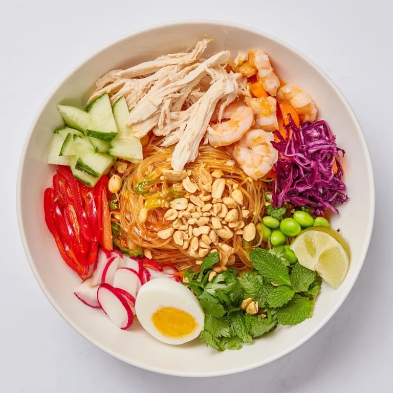 Ersetze das Huhn und die Garnelen durch festen Tofu, der ähnlich zubereitet wird, um die Proteine zu ergänzen.