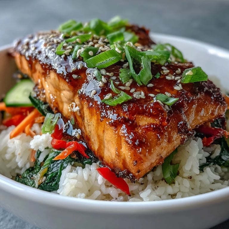 Diese asiatisch inspirierte Schale vereint zarte Lachsfilets mit einer würzigen Soja-Ingwer-Glasur auf fluffigem Reis. Das frische julienne Gemüse von Karotten, Gurken und Paprika liefert knackige Textur, während gerösteter Sesam und Frühlingszwiebeln das Aroma abrunden.