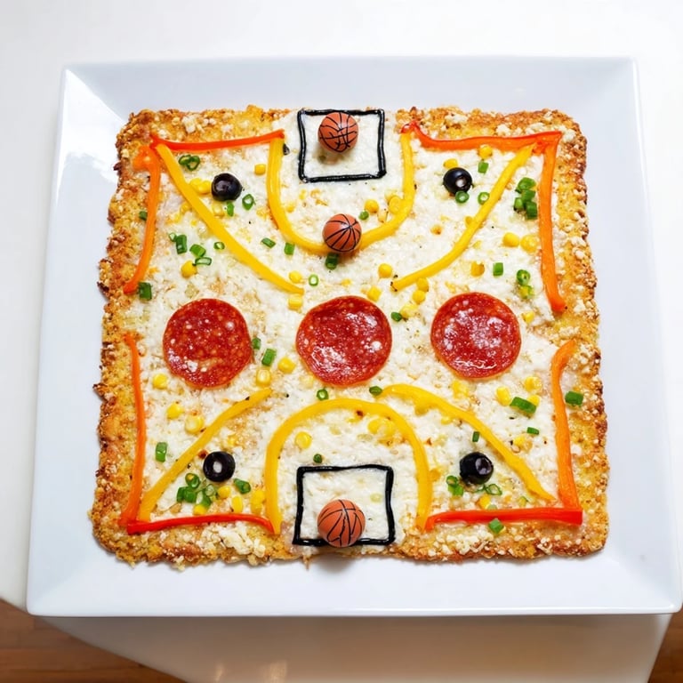 Merken Ein verspielter, bei der Menge beliebter Pizzagenuss, der wie ein Basketballfeld aussieht, komplett mit lustigen Freiwurftoppings. Perfekt für Sportpartys oder Familienabende.