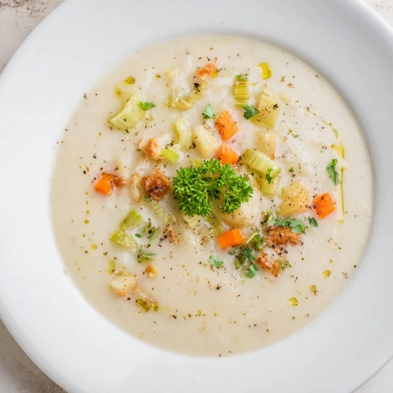 Merken Eine samtige vegane Kartoffelsuppe mit geröstetem Knoblauch und Kräutern, perfekt für ein gemütliches, preiswertes Abendessen.