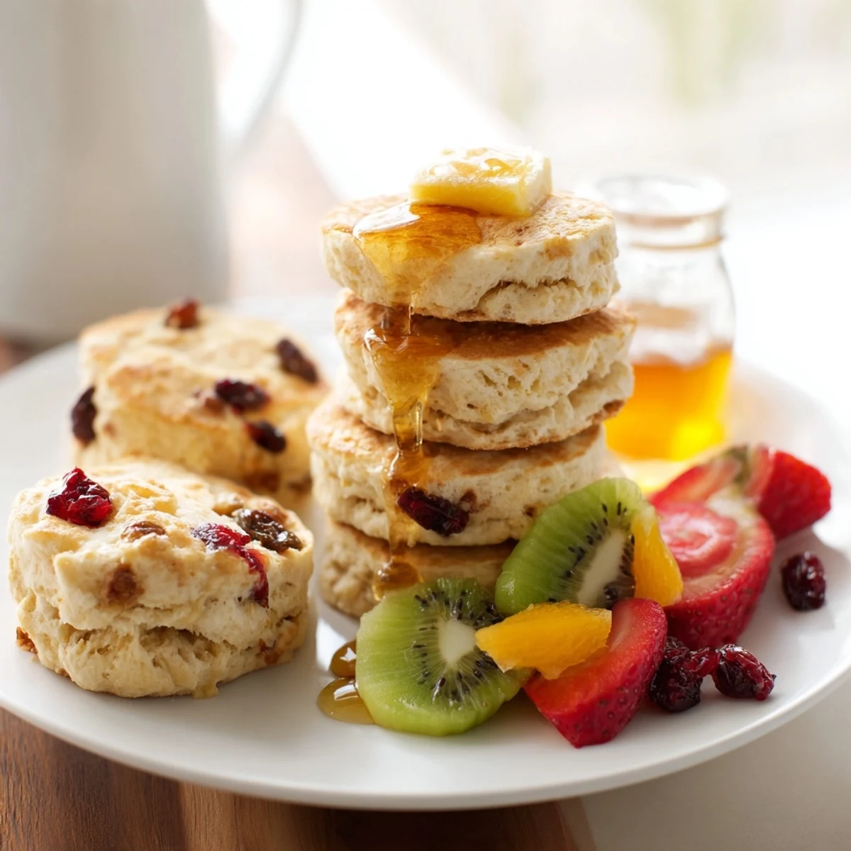Der Schlüssel zu einem stressfreien Brunch ist Vorbereitung. Ich mache die Pancakes und Scones am Morgen etwa eine Stunde vor dem Servieren. Sie schmecken am besten, wenn sie noch warm oder zimmertemperatur sind. Die Früchte kannst du auch am Vorabend vorbereiten und in eine luftdichte Schüssel im Kühlschrank legen. Am Morgen des Brunches brauchst du nur noch alles zusammenzustellen.