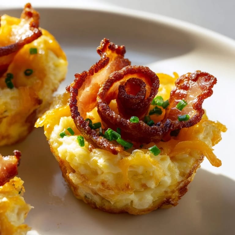 Merken Fluffige Rühreier, gebacken in Muffinförmchen und mit knusprigen Speckstreifen garniert – perfekt für eine einfache, beliebte Beilage zum Brunch.
