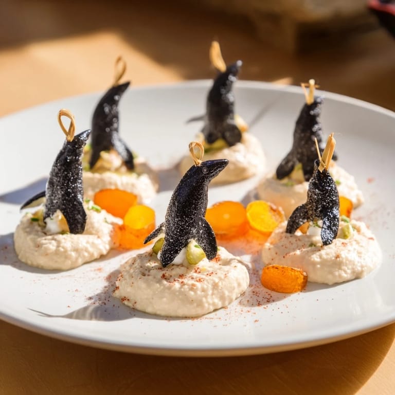 Merken Ein cremiger, herzhafter weißer Bohnendip, perfekt für Winterzusammenkünfte, geschmückt mit niedlichen Oliven-Pinguin-Dekorationen für einen festlichen Touch.