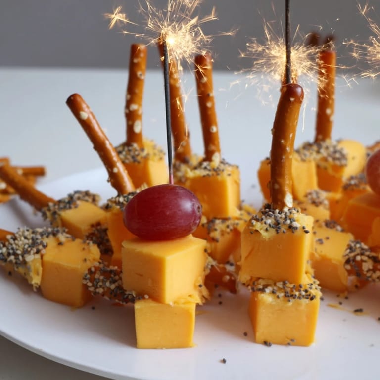 Merken Ein festlicher, mundgerechter Party-Snack mit scharfen Cheddar-Käsewürfeln auf knusprigen Brezelstangen, perfekt für den Jahreswechsel.
